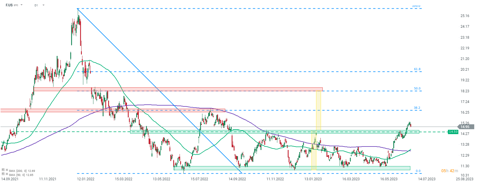 Ford Motor (F.US) is trading lower today, following release of US sales data for Q2 2023. Company reported a 9.9% YoY increase in total vehicle sales in the April - June 2023 period, to 531,662 units. The increase was driven by a 26.2% YoY jump in truck sales. Sales of SUVs and cars were lower compared to a year ago. Ford remained as a No.1 brand in the United States in Q2 2023. However, sales report also showed a weak performance of EV sales in Q2 2023, as they dropped 2.8% YoY. This was driven by a suspension of work at factory in Mexico. Operations at Ford's factory in Mexico were suspended in January and February in order to double the capacity of the plant. While operations at the facility have already resumed, the company is yet to recover inventory levels.