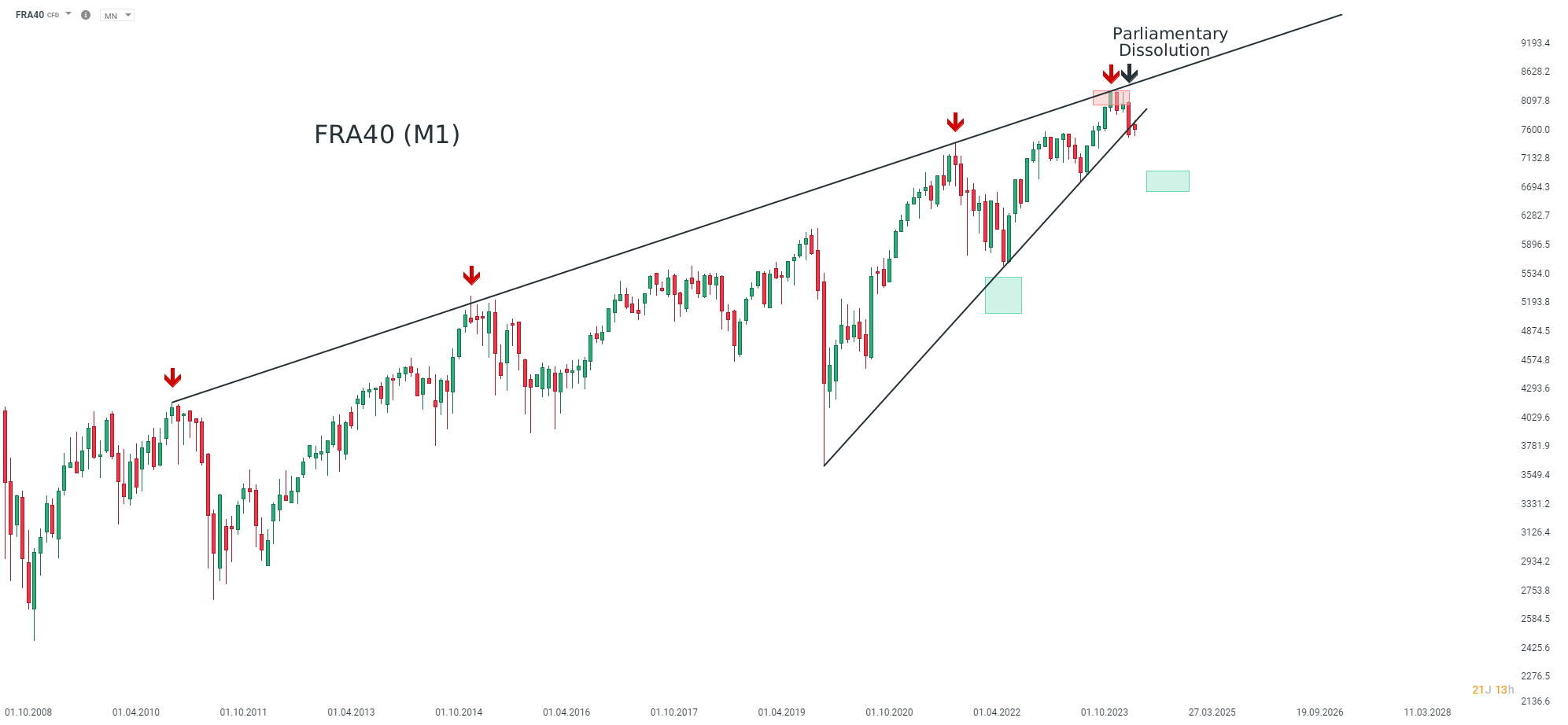 Institutional traders' profit targets (red box) confluent with the upper macro resistance trendline rejected CAC 40 prices to the downside before the political uncertainty occured in France. Source: xStation.