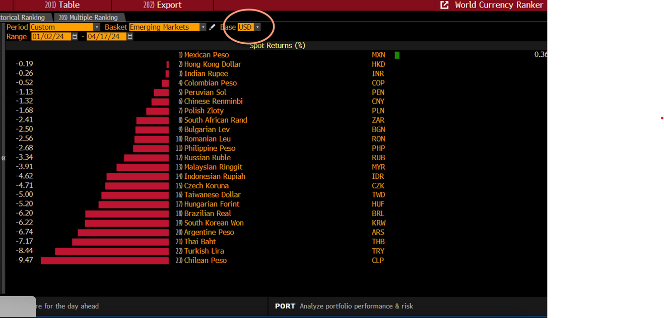 The impact of ‘higher for longer’ has sent bond yields surging across the world and has ended the rally in stock markets. It has also had a major impact on the global FX market. The dollar index has risen by 5% since the start of this year, and it is the top performer in the G10 FX space so far this year. USD/JPY is higher by 8%, while the euro is lower by more than 2% vs. the USD so far in 2024, while the pound has put up the best fight and GBP/USD is lower by 1.29% so far this year.