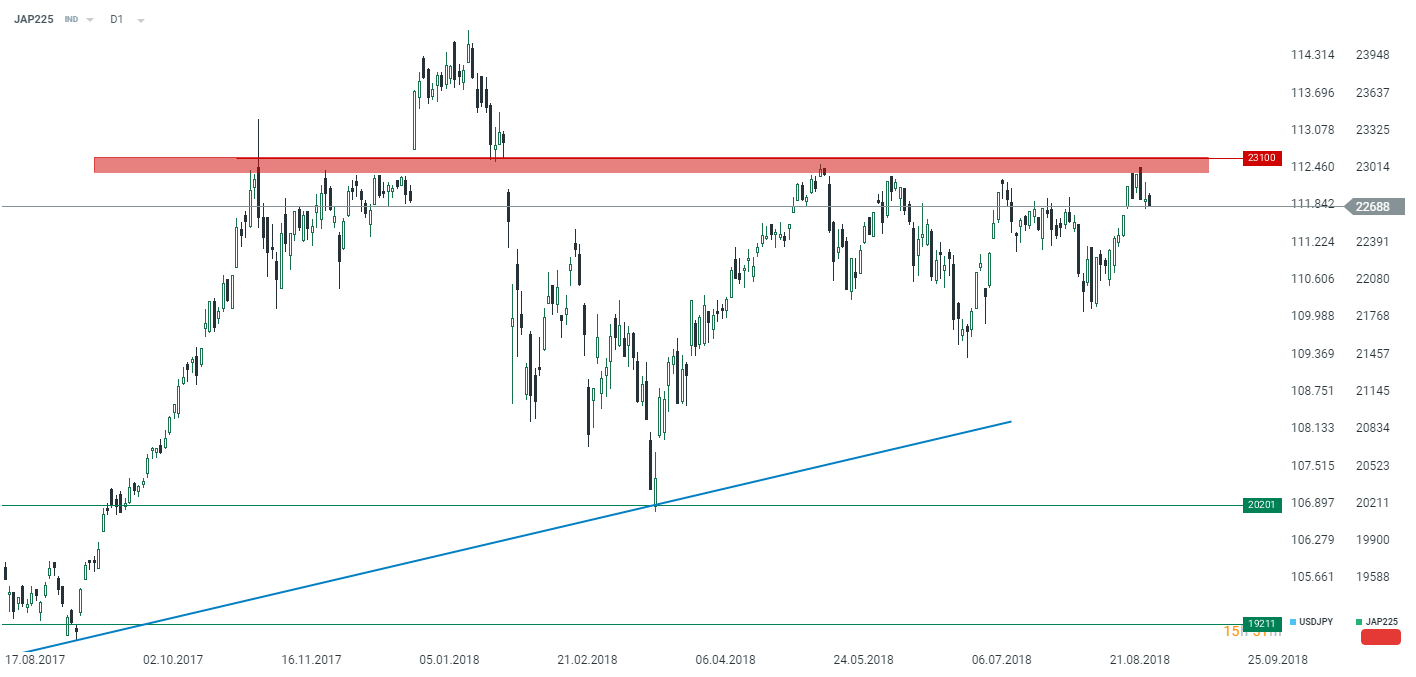 On the slightly higher JPY and overall poor sentiment across equities, the Japanese NIKKEI (JAP225) closed 0.7% lower. Technically the index looks as if it would be en route to much lower levels after rejecting the resistance placed at 23100 points. Source: xStation5
