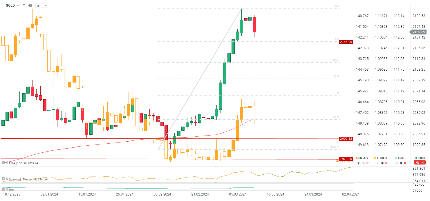 In response, we are seeing a rebound in yield and as trengthening of the dollar with the EURUSD falling around the 1.0900 level. Gold is also losing heavily, above 1% and testing the area of USD 2160 per ounce. The key short-term support is around the level of USD 2145 per ounce.