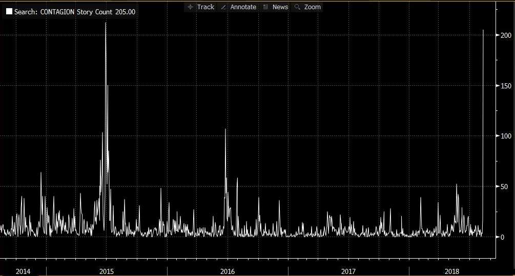 The main news today continues to surround Turkey and the ongoing slide in the Lira, with the currency sinking to another fresh all-time low. Given the recent plunge in not only the TRY but also other EM markets - the South African Rand dropped sharply by 10% during the Asian session - it is perhaps surprising that the US markets remain higher. Contagion has once more become a key buzzword, with the number of news articles mentioning “contagion” experiencing a huge spike higher on Friday.