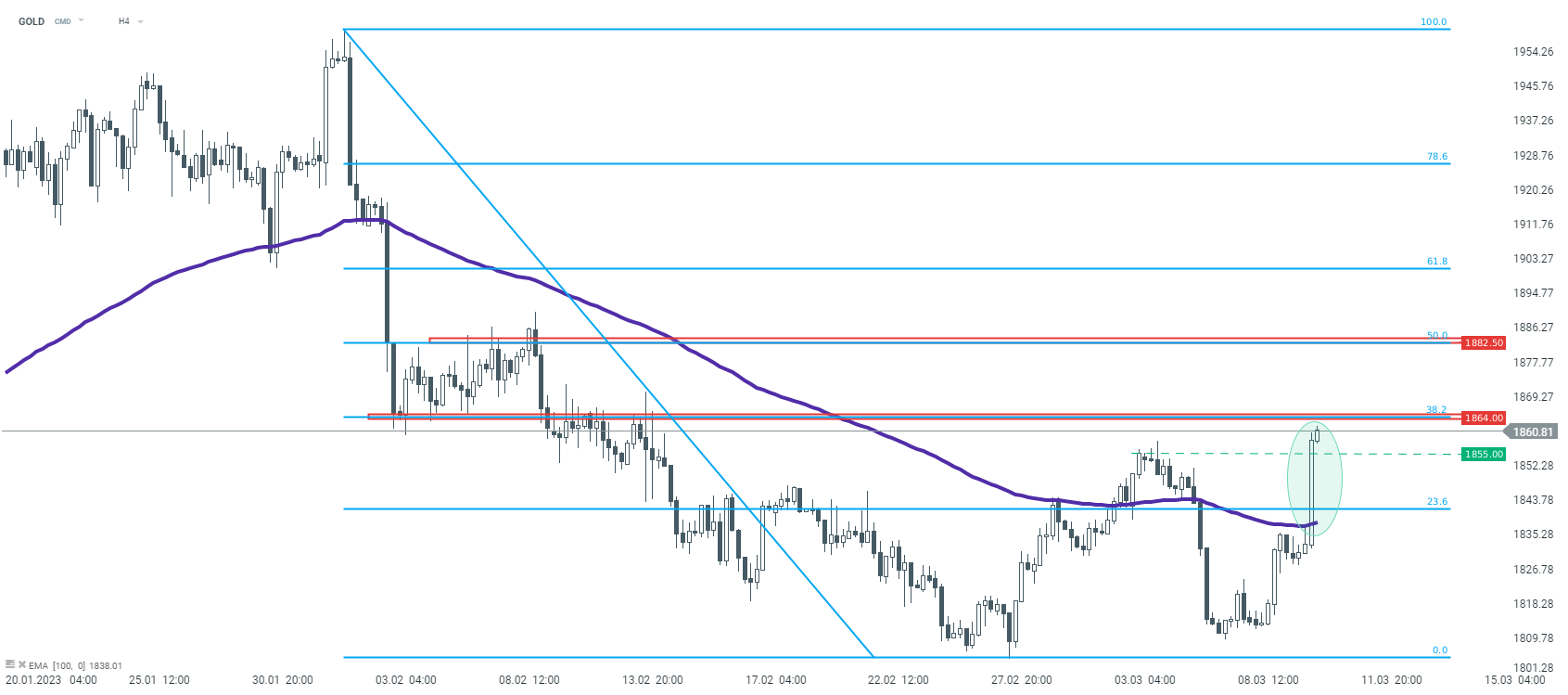 Looking at the gold chart, the price broke above two major resistance levels - EMA100 and then highs from March 6 highs around $1855, which may indicate a change of main sentiment to bullish. The key resistance at the moment is located around the $1864 zone, which coincides with the 38.2% Fibonacci retracement and previous price reactions.