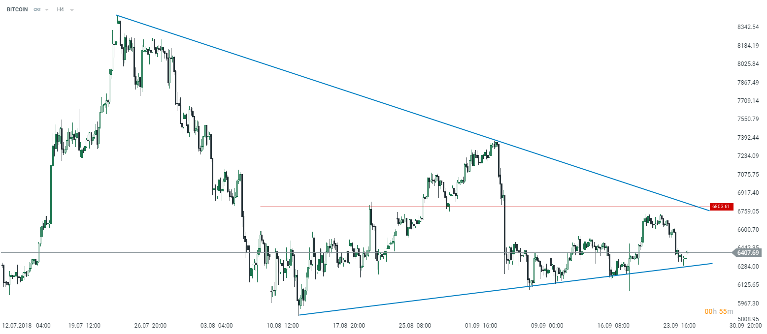 Bitcoin keeps moving within the triangle formation and based on the past moves one may expect the price to rise toward the upper bound the pattern (ca. $6800). Source: xStation5
