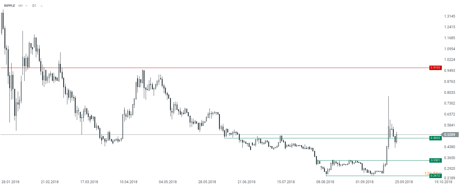 After the wild surge at the end of the past week Ripple settled down. However, it looks that the price is building the base for further gains as it has failed to break clearly below $0.5 thus far. Bulls could still hope for the rally continuation which could take the price even up to $0.97. Source: xStation5
