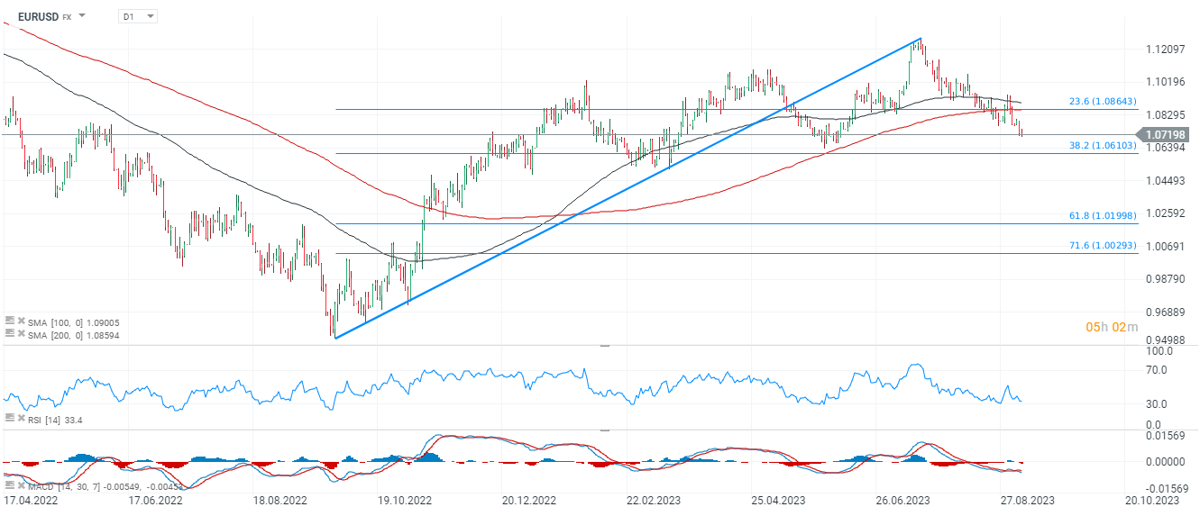Looking at the chart of EURUSD on the D1 interval, we can see that the upward trend line was already broken in the spring, and the gains in July, above 1.12, also stopped at its extension. Currently, the Fiboncci abolition levels indicate a likely test of 1.06, and although Ignazio Visco of the ECB indicated today that it is not true that supply is behind Fed policy - it seems that bankers, in the face of weakening macro data in Europe, have much less room for further increases than the Fed.
