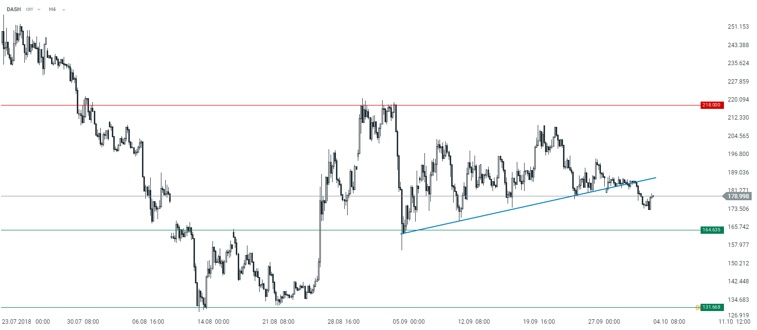 While Bitcoin keeps consolidating Dash has seen a breakdown of its crucial trend line in recent hours. Hence, barring a comeback above this line one needs to take into account an extended slide toward the nearest support which could be found nearby $164. Source: xStation5