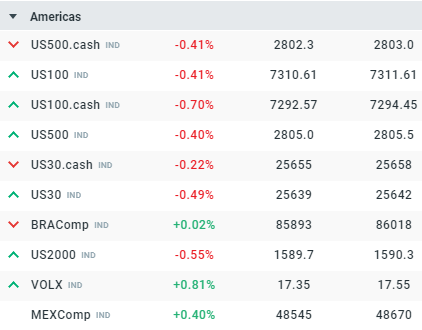 US markets are all trading lower apart from the volatility index (VOLX) which trades inversely to the US500. The declines at present seem to be just a pullback after Tuesday’s large gains but any further selling in the coming hours would put them back under pressure of steeper declines. Source: xStation