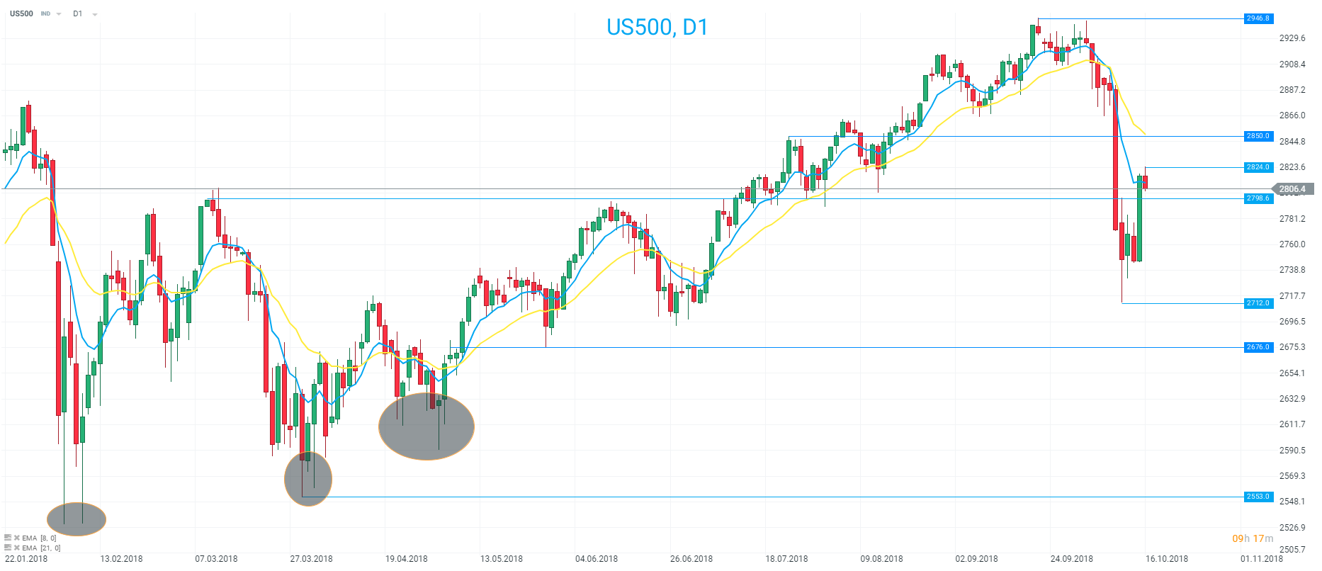 The US500 bounced strongly yesterday but remains in a downtrend according to the EMAs. Previous lows have shown a retest and hold before a recovery could ensue and if price moves back below 2799 then another attempt at recent lows around 2712 may occur. Source: xStation