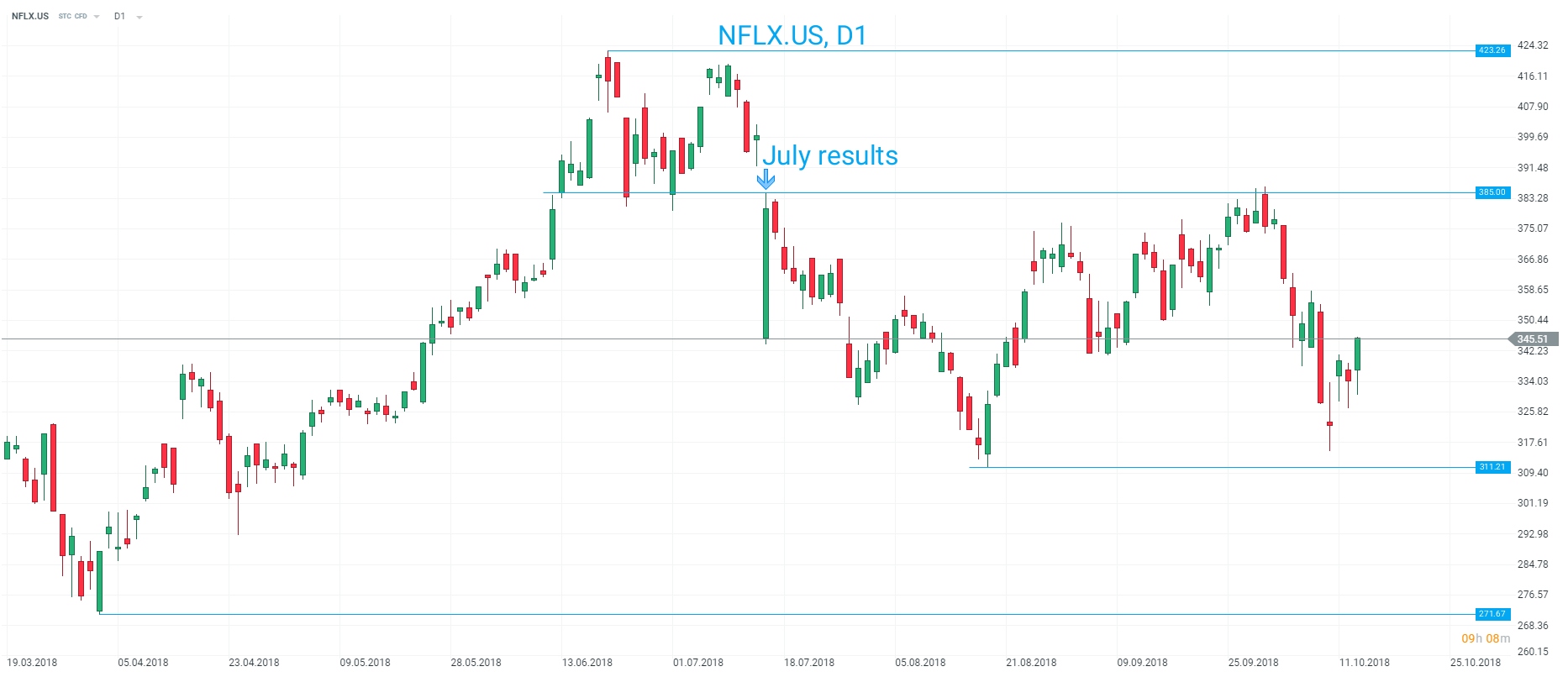 Netflix shares are called to open strongly higher by around 10% and somewhere near 380 after a pleasing earnings release last night. The news has seen the market jump higher by almost the same amount as it fell back in July on its last trading update and could boost wider investor sentiment in FAANG and tech stocks in general. Source: xStation