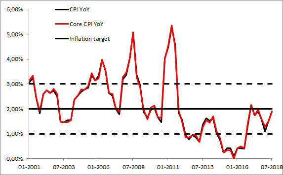 While the Australian dollar is among the underperformers the other Antipodean currency - New Zealand dollar - is trading higher against all the other majors. An inflation report released overnight can be named as a reason as it showed a strong pick-up in the price growth. On the quarterly basis inflation in the third quarter of 2018 reached 0.9% against expectations of 0.7% QoQ and previous reading of 0.4% QoQ. The headline reading on the year-over-year basis showed inflation accelerating to 1.9% YoY against expectations of 1.7% YoY and prior reading of 1.5% YoY. However, one of the main factors behind such a jump were higher fuel prices what resulted from both - higher oil prices in the markets and newly imposed fuel taxes. Having said that, the effects may can be partially viewed as one-offs and may not be sustained over the long period of time. Because of that it is unlikely that this reading will change anything when it comes to the attitude of the Reserve Bank of New Zealand. RBNZ announced that it will stay cautious when conducting monetary policy and will not rush any moves in the interest rate to warrant that once such move happens it will be permanent. Nevertheless, the reading turned out to be a positive surprise for investors and sent NZDUSD higher.