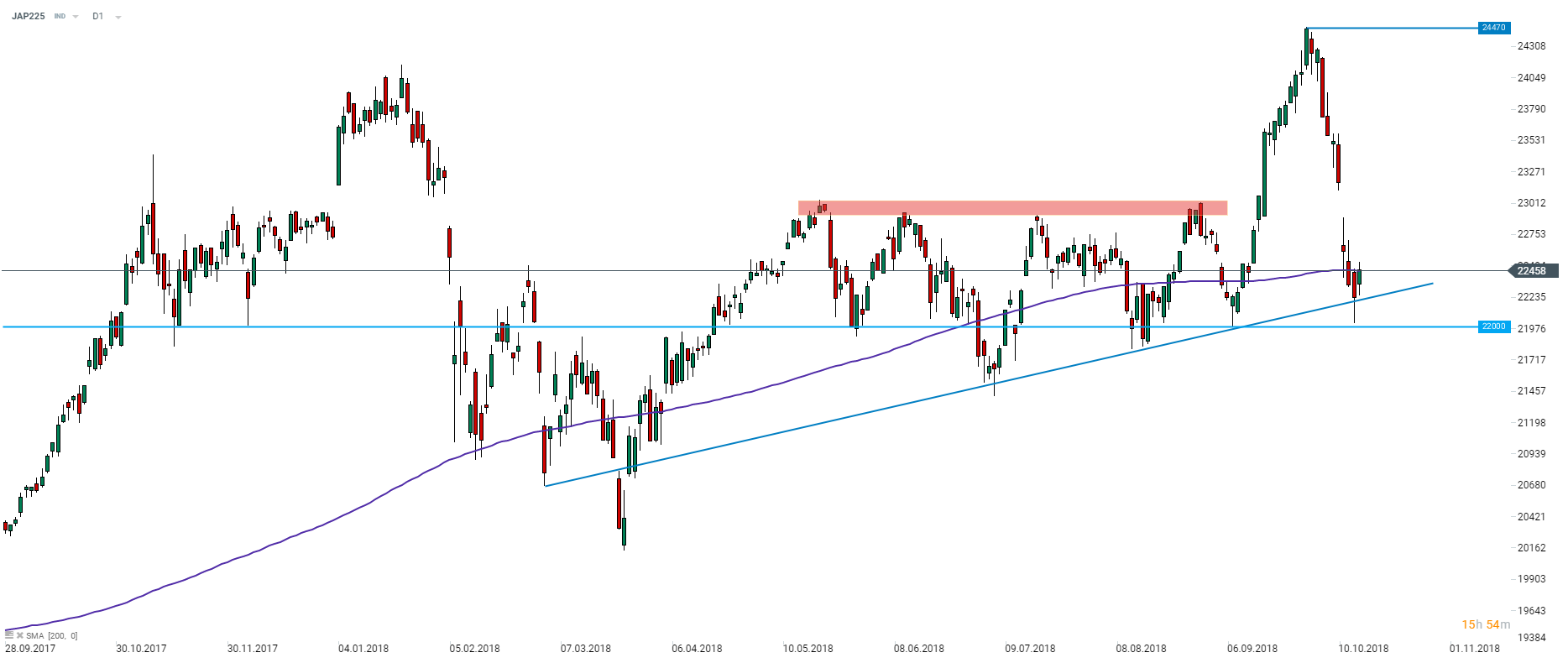 JAP225 (Nikkei futures underlying) bulls managed to defend the 22000 pts handle and the upward trendline. The index jumped today but the momentum was not strong enough to warrant a close above the 200-session moving average (purple line on the chart above). Source: xStation5
