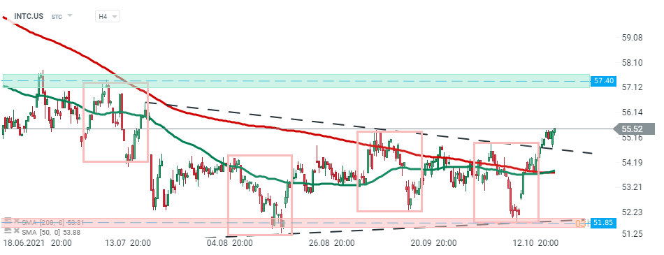 Intel (INTC.US) stock tested an earlier broken upper limit of the wedge formation which coincides with the upper boundary of the 1:1 structure and moves higher. If current sentiment prevails after the earnings release, then upward move may accelerate towards resistance at $57.40 which is marked by previous price reactions. However it is important to note that Intel shares have experienced significant falls on the day of results over the past two quarters. If a similar situation occurs today, then nearest major support to watch lies at $51.85. Source: xStation5