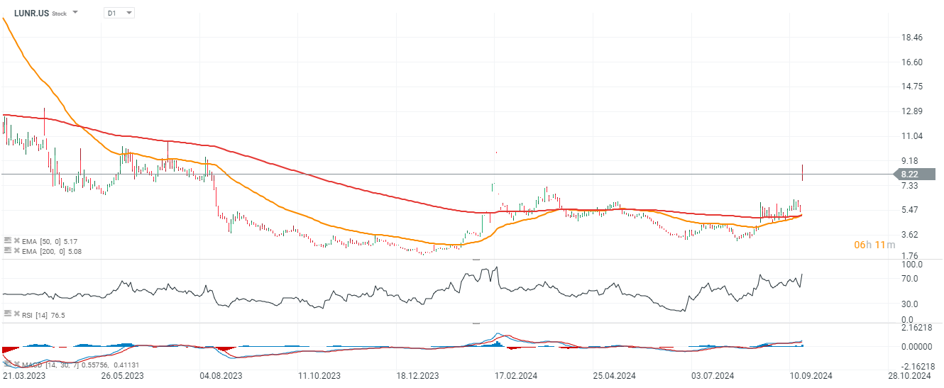 Shares of Intuitive Machines (LUNR.US) rallies today more than 50% as company sign worth max. amount of $4.82 billion NASA contract for moon data satellites. Current market cap of Intuitive Machines is $1.1 billion, however huge amount of debt and diluting shareholders ended with big shares crash since 2021. We can see also improved sentiments across other space payload company, Momentus (MNTS.US) gains almost 6% however Vrigin Galactic (SPCE.US) drops 3%, and Redwire shares (RDW.US) are flat.