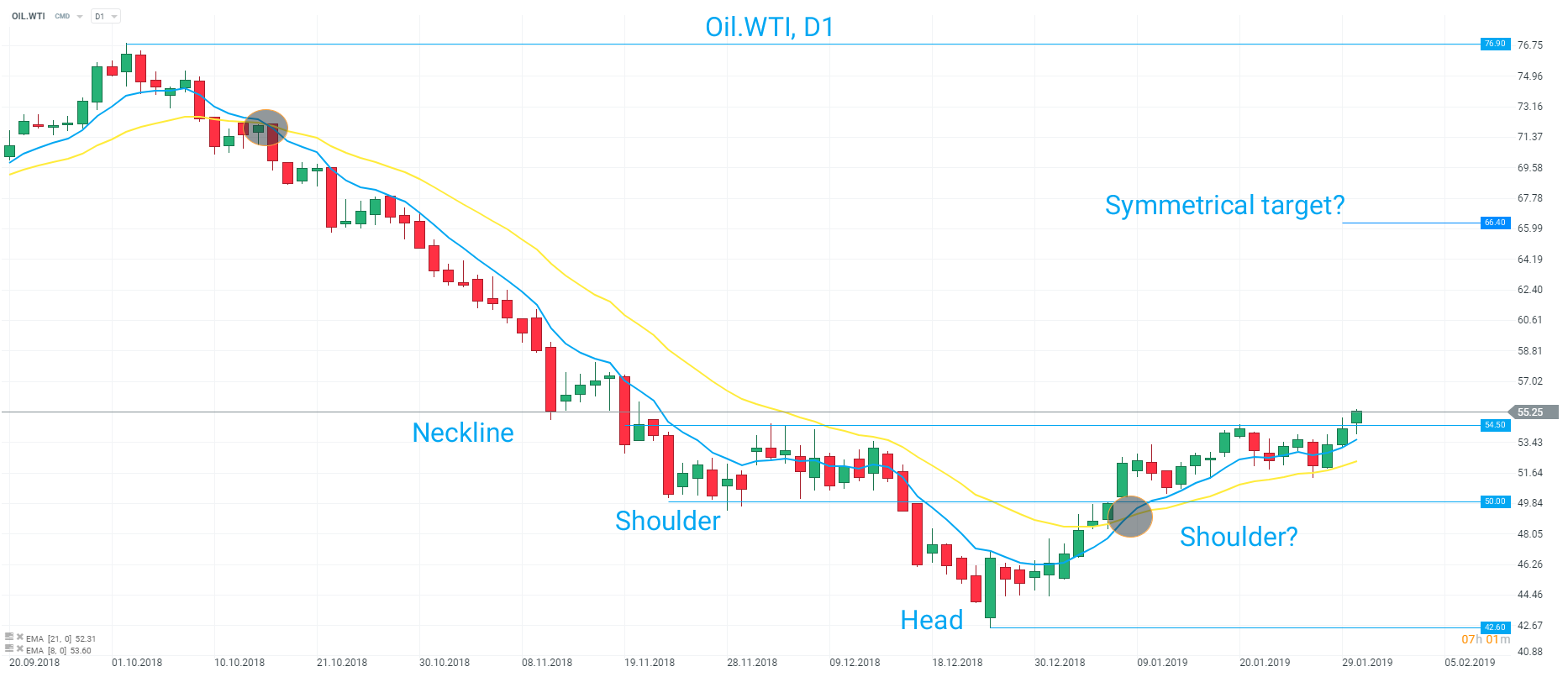 In breaking above 54.50 the market has broken the neckline in a potential inverse head and shoulders formation. This would target a significant move higher and remains valid while price trades above 54.50. Source: xStation