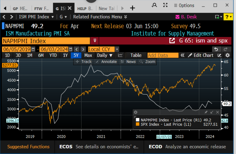 The Eurostoxx index is being led higher by its IT sector, interestingly, the industrial sector is also higher by more than 0.8%, although France and Italy posted weaker than expected Manufacturing sector PMIs for May. Overall, the Eurozone manufacturing sector PMI was marginally lower than forecast for May at 47.3, down from 47.4, but still in contraction territory. The US ISM reading is also worth watching later today. The market is expecting the manufacturing ISM to remain below the crucial 50 level at 49.5, and for the prices component to drop to 59 in May from 60.9 in April. Interestingly, although the survey data has been weak for the manufacturing sector in recent months, the hard data for this sector has outperformed, suggesting that the manufacturing ISM may not be a reliable recessionary indicator. This may explain why the ISM, which used to have a strong relationship with the S&P 500, has diverged in the past year, as you can see below.