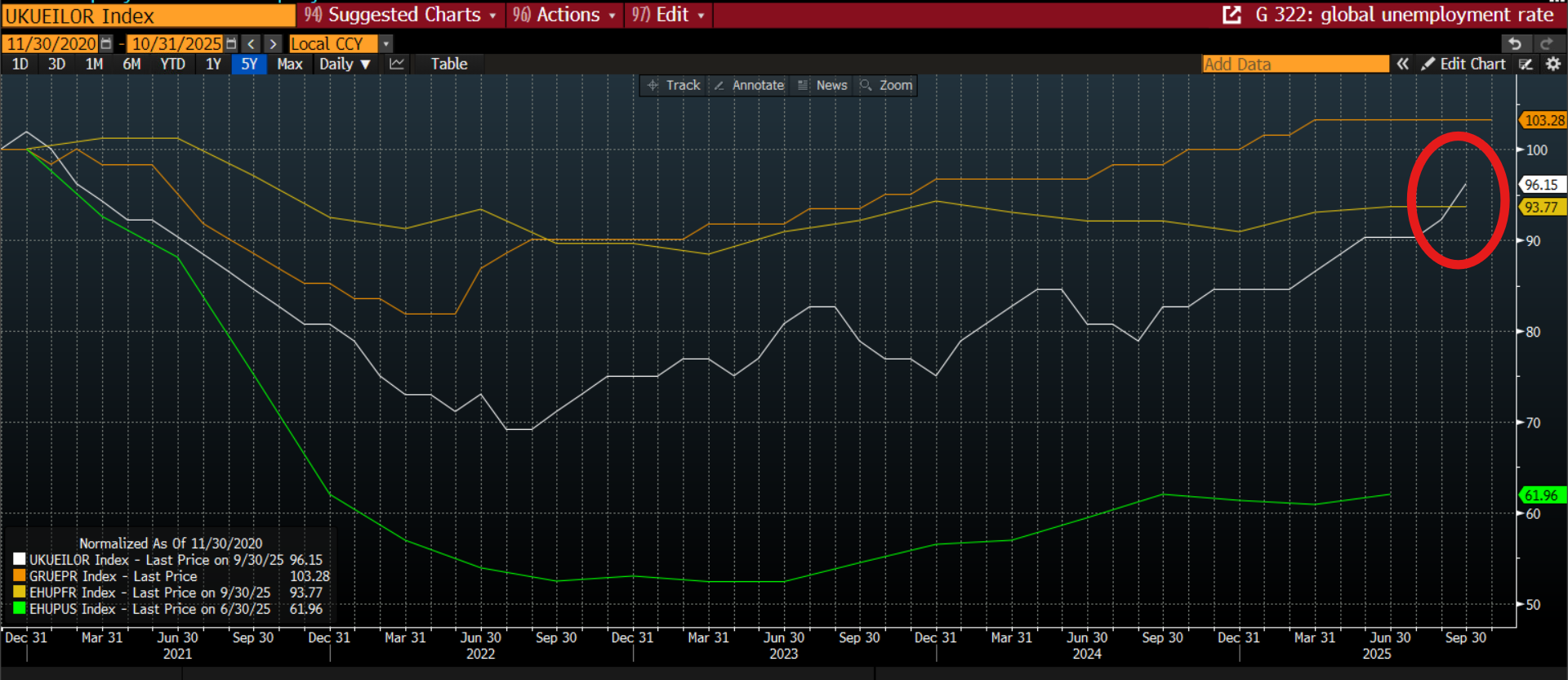 Chart 1: UK (white line), France and Germany unemployment rates, normalized to show how they move together.