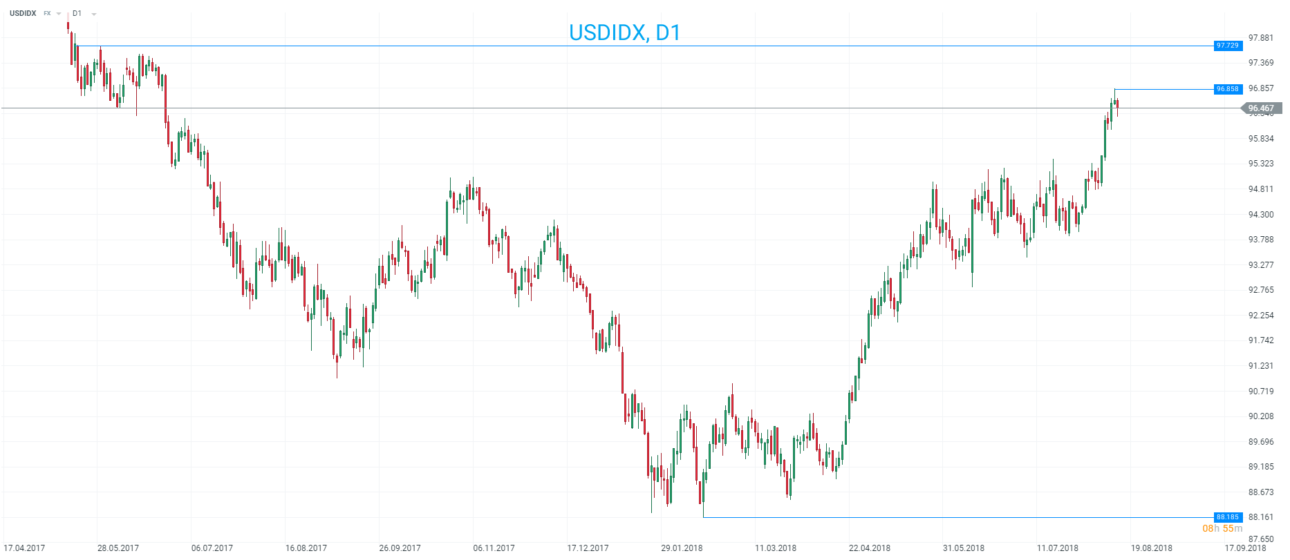 The USD index (USDIDX on xStation) has rallied strongly in recent months without the economic environment becoming far more favourable for the buck. Yesterday saw an inverted hammer just shy of the 97.00 handle. Could the market have moved a bit too far a bit too soon? Source: xStation