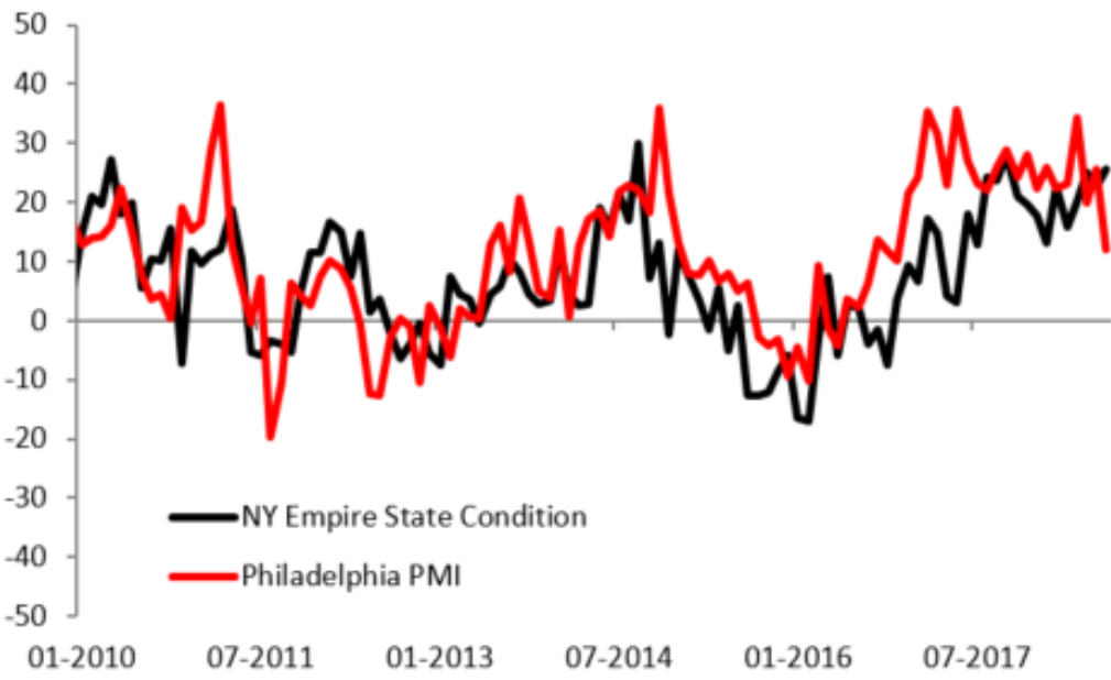 The Philly fed fell sharply in the latest release, which could be a warning of an impending slowdown. The NY empire state equivalent may now be seen to take on a greater significance to see whether it supports or contradicts today’s release. Source: XTB Macrobond