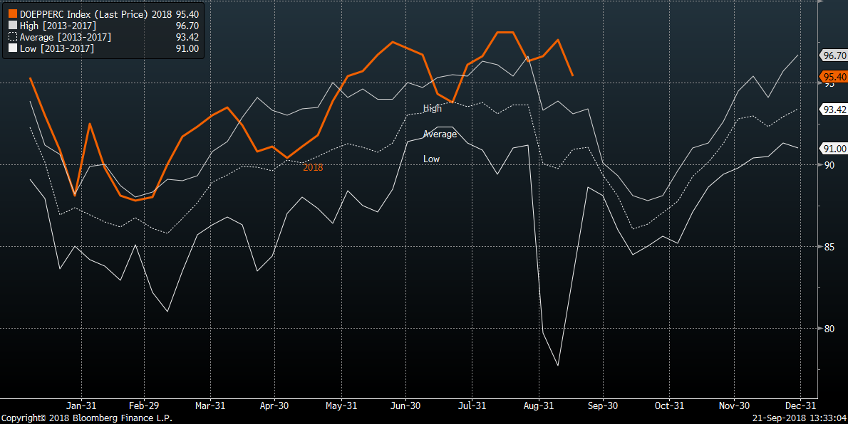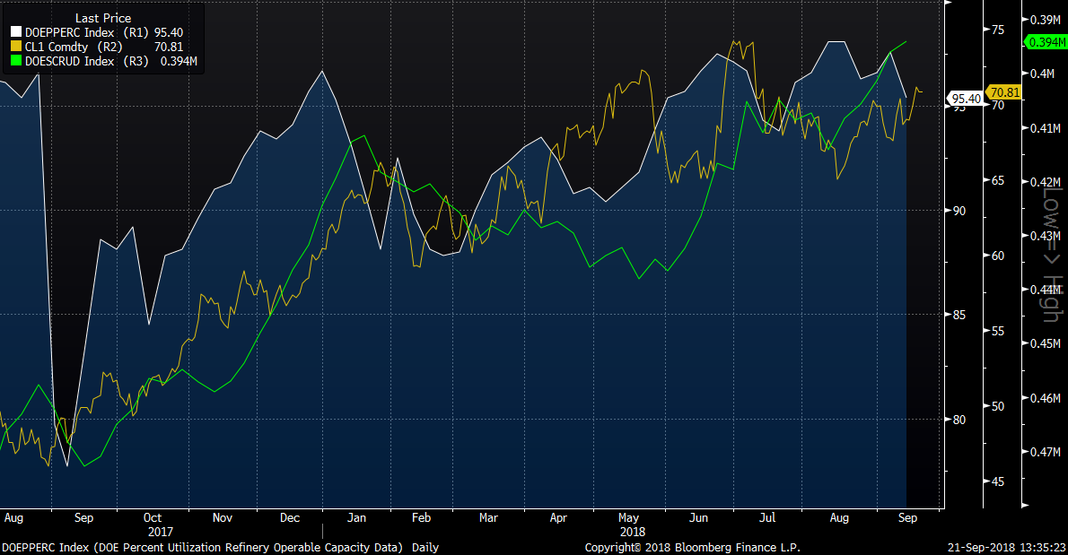 The utilization rate in the US oil refineries was substantially higher this year in comparison to previous 5 years. Source: Bloomberg