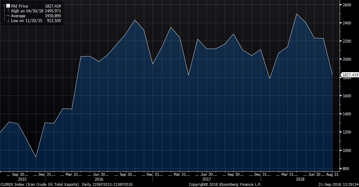Iranian exports decline sharply even without direct sanctions in place yet. Source: Bloomberg