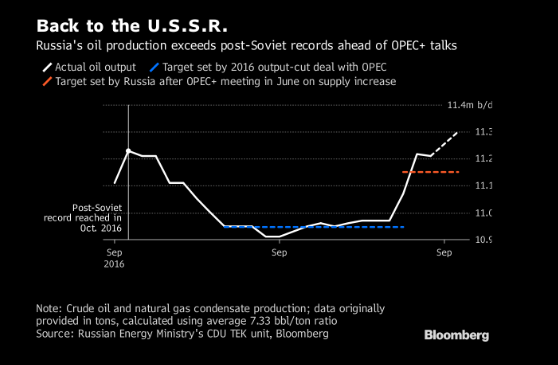Russian oil output surpassed levels from the end of the Soviet era and forecasts point for more upside. Source: Bloomberg
