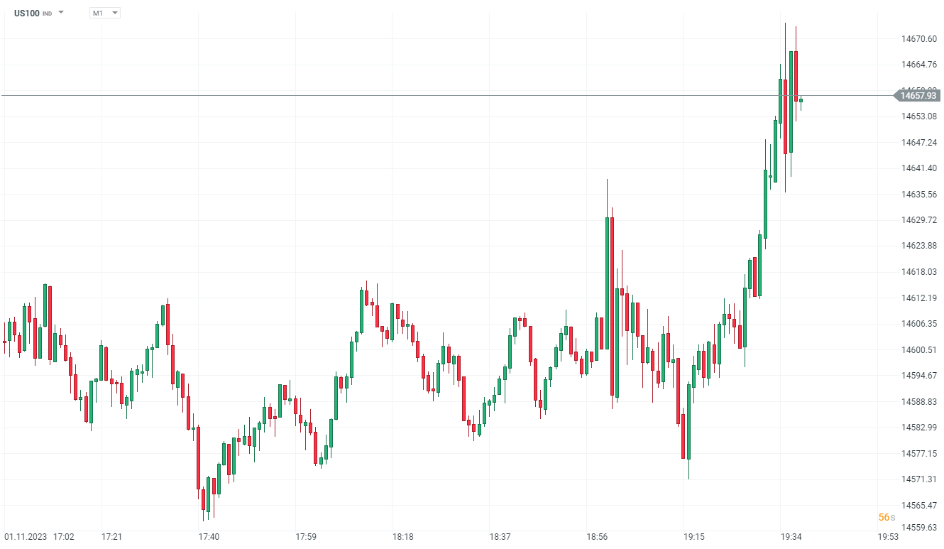 After quite dovish Powell speech US100 surges more than 1% in first reaction to press conference.