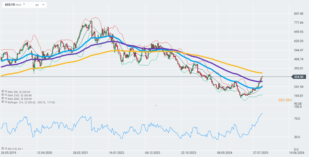 Kering (KER.FR) shares are up nearly 5% today, but in the longer term, they continue their most dynamic rebound since 2022 after an almost dramatic sell-off that pushed the former fashion giant's shares down to 2016 levels. Source: xStation