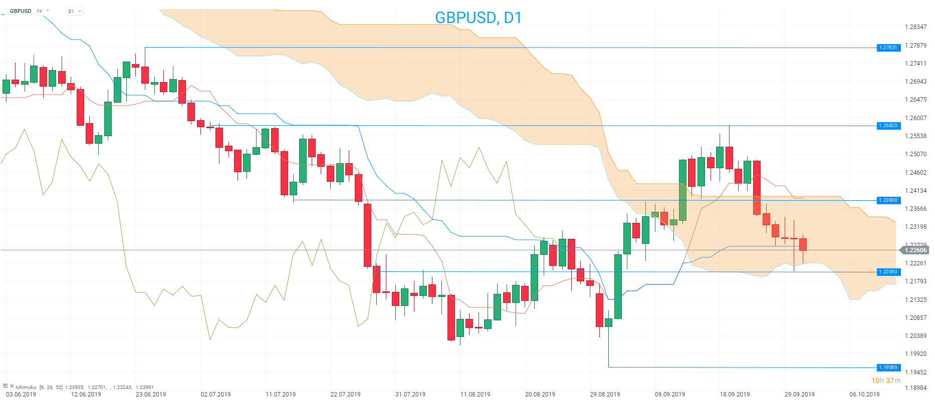 GBPUSD bounced from its lowest level in 4 weeks yesterday at 1.2205 - a level that coincides with the bottom of the D1 cloud. Source: xStation