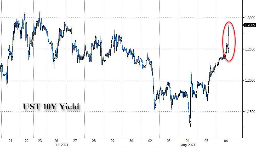 US Treasury 10y yield spiked after jobs data. At press time it is trading just slightly above the 1.30% mark (+7 bps on the day) - highest since mid-July. Source: Bloomberg via ZeroHedge