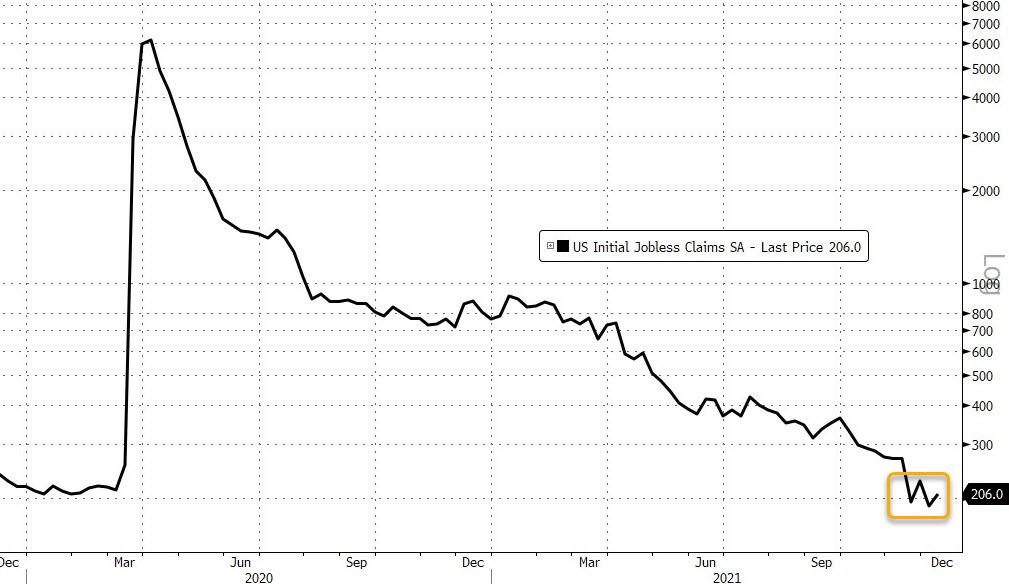 Today's data showed the number of Americans filing new claims for unemployment benefits increased by 206 thousand last week, still remaining around pre-pandemic levels. Source: Bloomberg via ZeroHedge