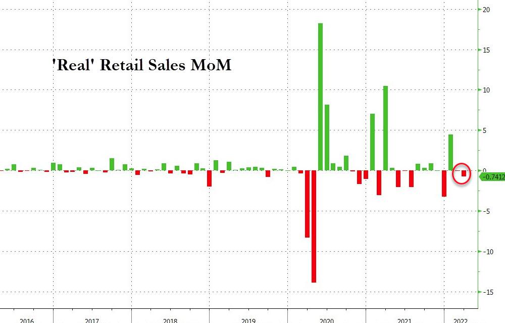 "Real" retail sales are negative for the second straight month. Source: Bloomberg via ZeroHedge