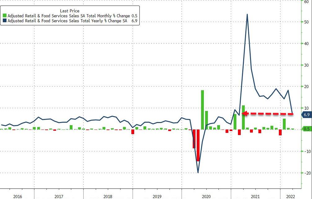 Retail sales rose 0.5% t in March, however on a yearly basis sales decelerated dramatically (up only 6.9% YoY - the lowest since Feb 2021). Source: Bloomberg via ZeroHedge