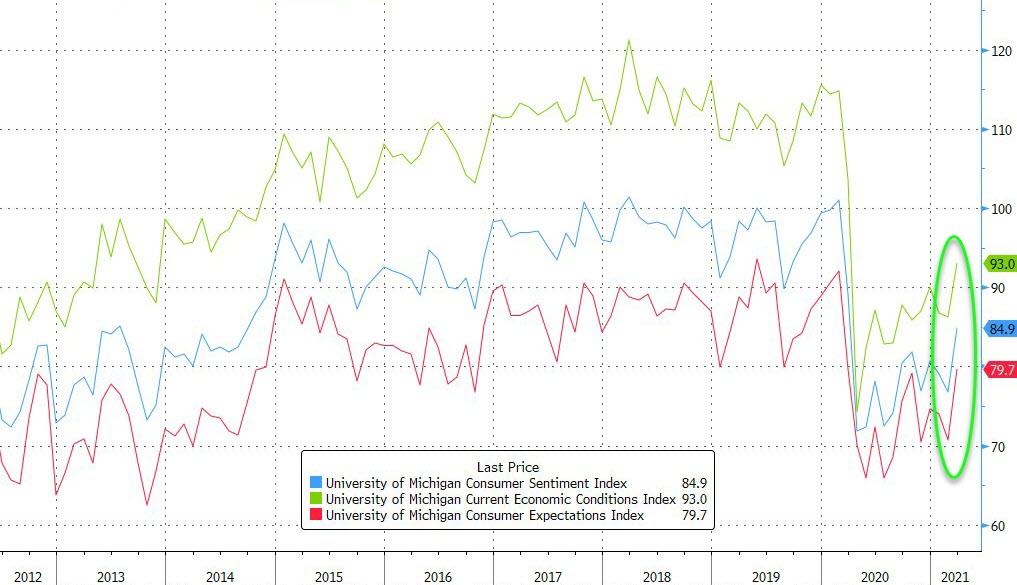 A consumer sentiment reading for March from the University of Michigan jumped to the highest level in a year following the "third disbursement of relief checks and better than anticipated vaccination progress,” said Richard Curtin, chief economist of the survey. Consumer sentiment was revised higher to 84.9 in March, up from a preliminary estimate of 83 and above analysts' expectations of 83.6.