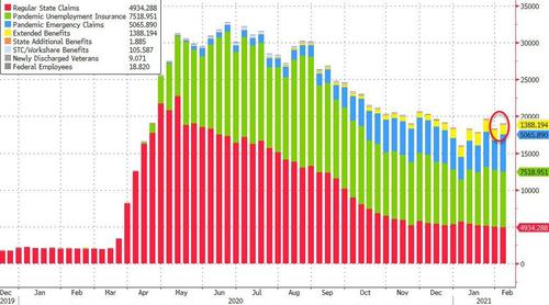 Total number of Americans claiming some form of government aid returned back above 19 million last week. Source: Bloomberg via ZeroHedge.