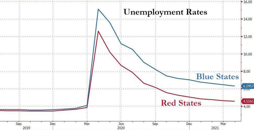 This is also confirmed by the Goldman research, which shows that the number of claims under regular state programs varied further between states that continue to pay benefits and those that no longer support the unemployed. In other words, while the number of unemployed claims - both initial and continuing - has fallen sharply in Republican-controlled states and initiated labor market normalization, in Democrat-controlled states their number remains roughly at the same level.