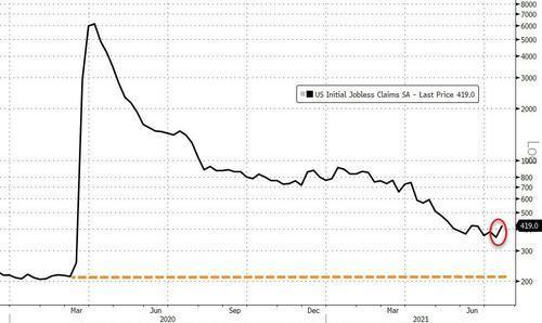 Weekly jobless claims unexpectedly moved higher last week despite hopes that the US labor market is poised for a strong recovery heading into the fall. Initial claims increased 51k to a seasonally adjusted 419k for the week ended July 17, well above analysts' expectations of 350k and more than the upwardly revised 368k from the previous period. Continuing Jobless Claims fell to 3.236 million from 3.265 million in the previous week. It is a new pandemic low although figures came above market forecasts of 3.1 million. Continuing claims, which run a week behind the headline number, have been falling since late June, and next week's report will provide more hints on how hiring fared in July.