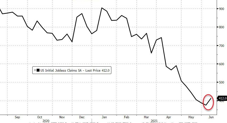 Initial Jobless Claims unexpectedly rose last week from 375k to 412k. Source: Bloomberg