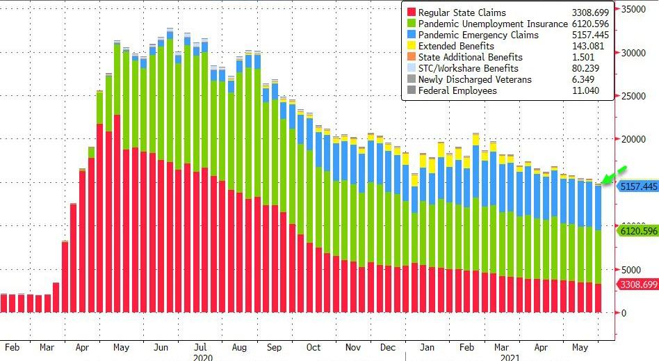 The total number of Americans on the dole dropped below 15 million for the first time since April 2020. Source: Bloomberg via ZeroHedge