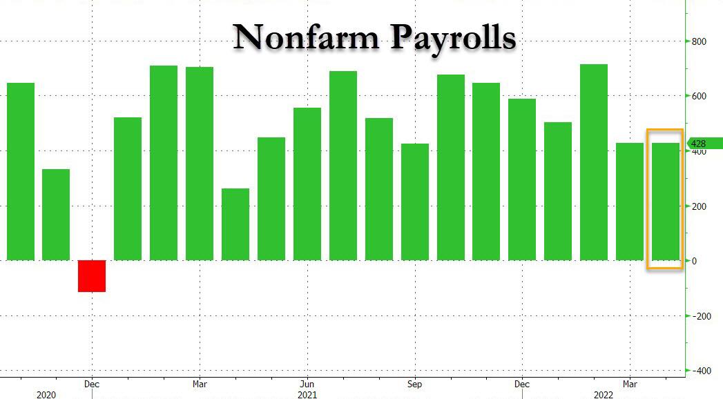 - The Labor Department's closely watched employment report showed that nonfarm payrolls grew by 428K the same as in March after being downwardly revised, and roughly 40K more than market forecasts.