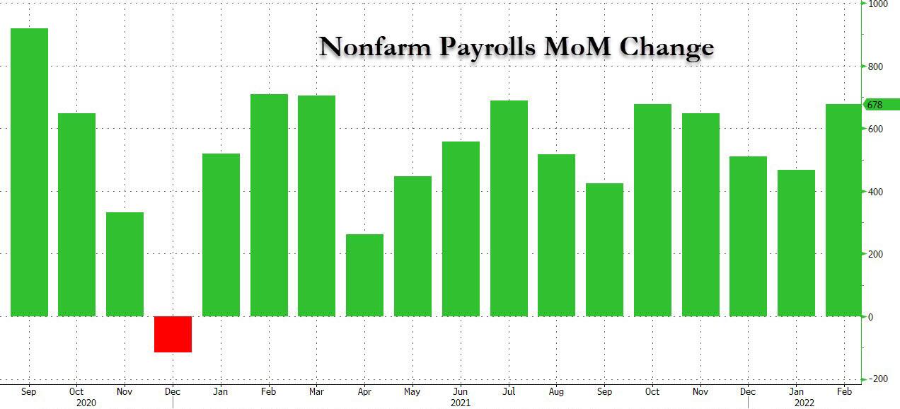 NFP employment jumped by 678k jobs in February, the most in seven months. Source: Bloomberg via ZeroHedge