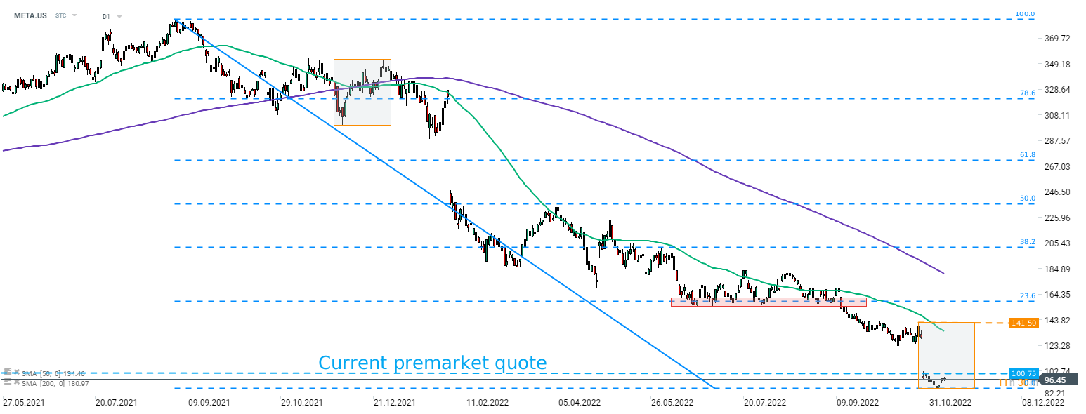 Shares of Meta Platforms (META.US) trade over 3% higher in premarket and are set to open above $100.00 - the highest level since the day after Q3 2022 earnings release. However, this jump is barely visible on the chart of the company, following an over-70% YTD drop. From a technical point of view a break above the upper limit of the Overbalance structure at $141.50 would be needed for the outlook to get more bullish. However, it would require a 40~% rally from current price levels.