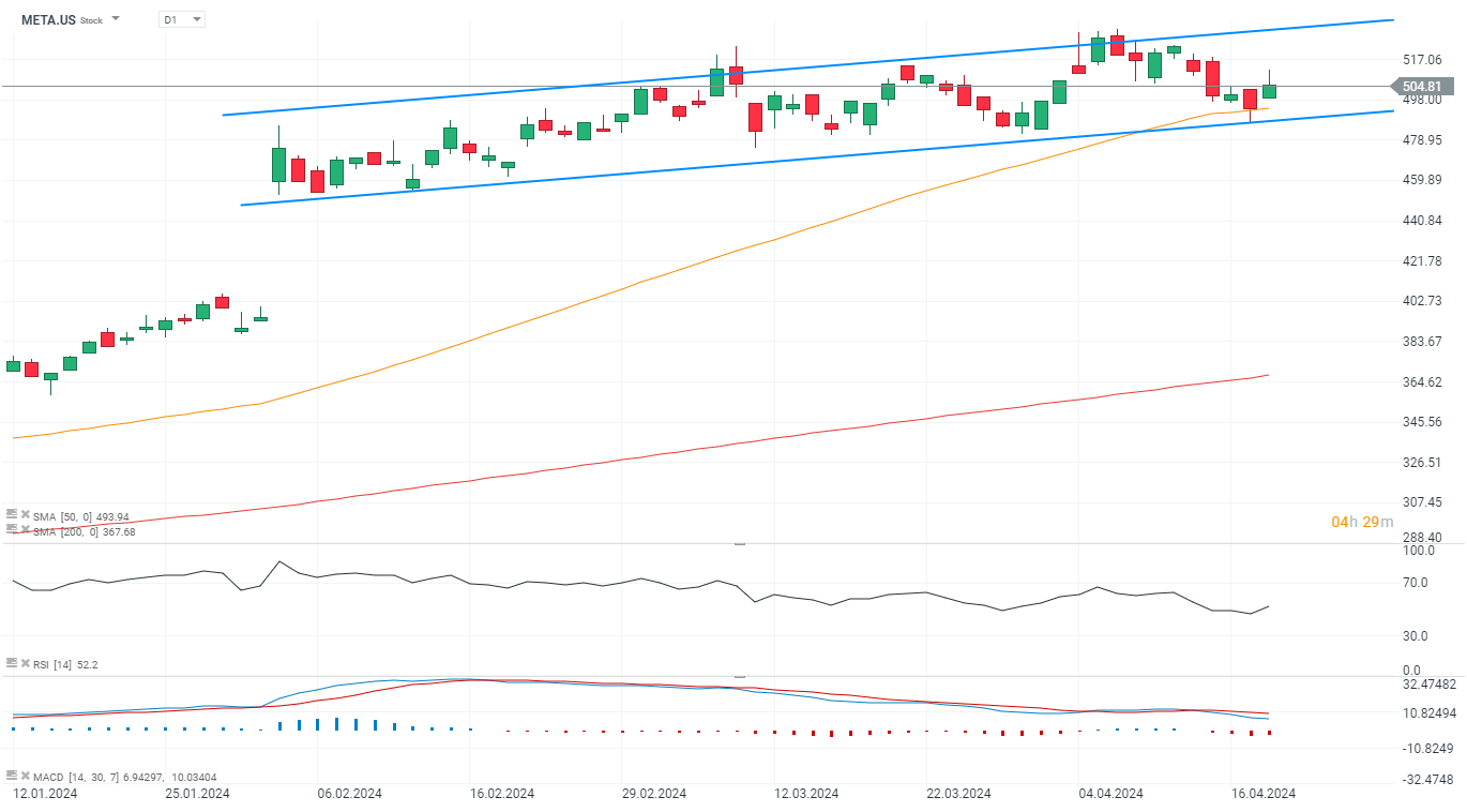 Meta Platforms (META.US) gains more than 2% after new, LLama3 training chatbots language model debut. Also, Bernstein analysts raised the price target on Meta to $590 from $535 previously, maintaining the outperform rating (19% above today price). New artificial intelligence training model, its latest company step to move forward with other large LLM companies such as Microsoft (OpenAI), or Alphabet (Google) and signal that Meta is really focused on AI business catalysts. However, effects of that trend may be not seen immediately and large part of that move is supported by very strong, speculative sentiment among AI stocks and BigTech.