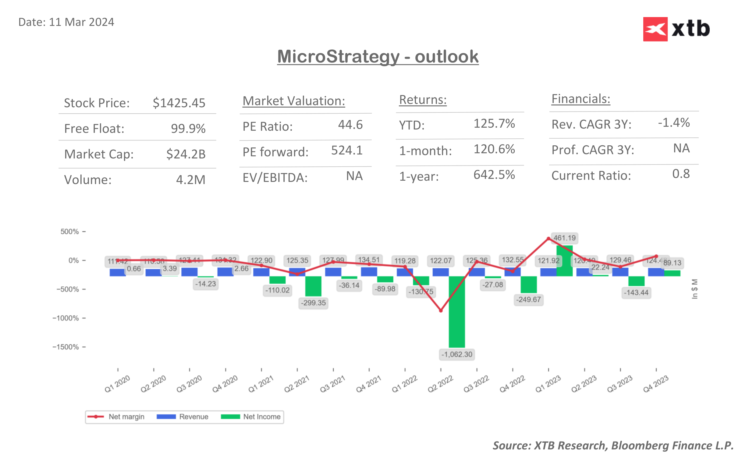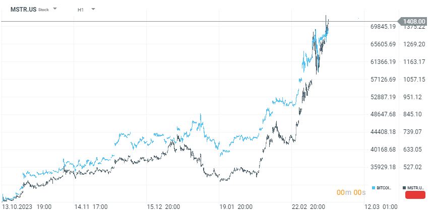 MicroStrategy's (MSTR.US) shares are gaining nearly 10% in pre-session trading. As the company increases its exposure to the cryptocurrency market, its stock prices are becoming more correlated with the price of BTC. Consequently, its market capitalization is becoming less dependent on its core business areas from a few years ago, which used to be IT, Cloud, and Business Intelligence solutions and services.