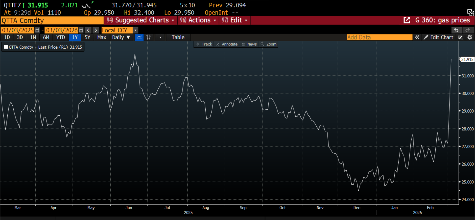 For now, the chances of that are low. In 2022, when Russia invaded Ukraine, the price spike was combined with a very low inventory of European gas, which sent prices soaring. While gas inventories tend to be slim, Europe is much less reliant on gas from Russia and the Middle East and instead gets the bulk of its LNG from the US, another major producer. This means that the European market should be able to absorb a few weeks of disruptions to Qatari LNG flow. However, if Qatar’s production takes longer to come back on line, or if it cannot be exported due to the dangers of tankers travelling through the Strait of Hormuz, then we may start to see US gas prices rise. So far, US gas prices have risen by a moderate 6%, compared with an 82% increase in European Nat gas prices in the past week. We will be watching US Nat Gas prices closely in the coming days, any significant uplift to these prices would signal another energy price shock for Europe is coming.