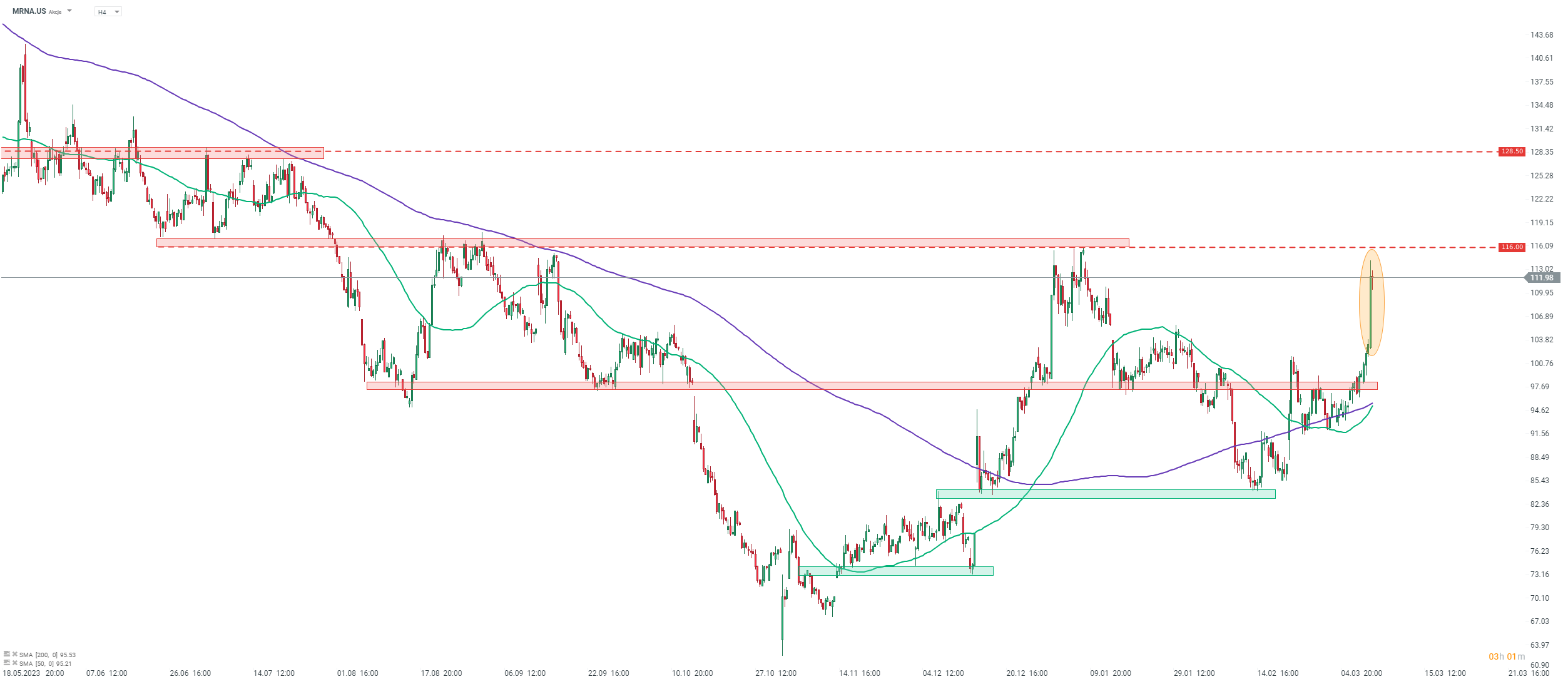 Taking a look at Moderna (MRNA.US) chart at D1 interval, we can see that the stock surged today and climbed to the highest level since January 8, 2024. Share price is approaching a resistance zone in the $116 area, marked with previous local highs. A break above it would open the way towards the next major resistance zone to watch, which can be found in the $128.50 area.