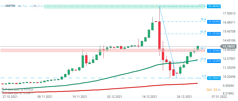 USDTRY - Turkish lira weakens at the beginning of new year. Pair broke above the major resistance at 13.30 which coincides with 38.2% Fibonacci retracement of the last downward correction. Source: x Station5