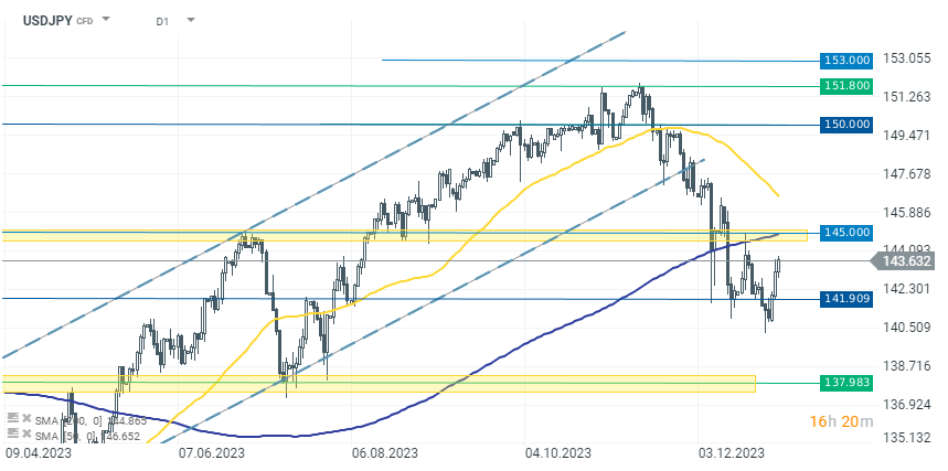 Today, USDJPY is gaining 0.40%, continuing its dynamic rebound for the third consecutive session. Currently, the rate is approaching the key level of 145.000, which has repeatedly and effectively prevented bulls from rising. Source: xStation 5.