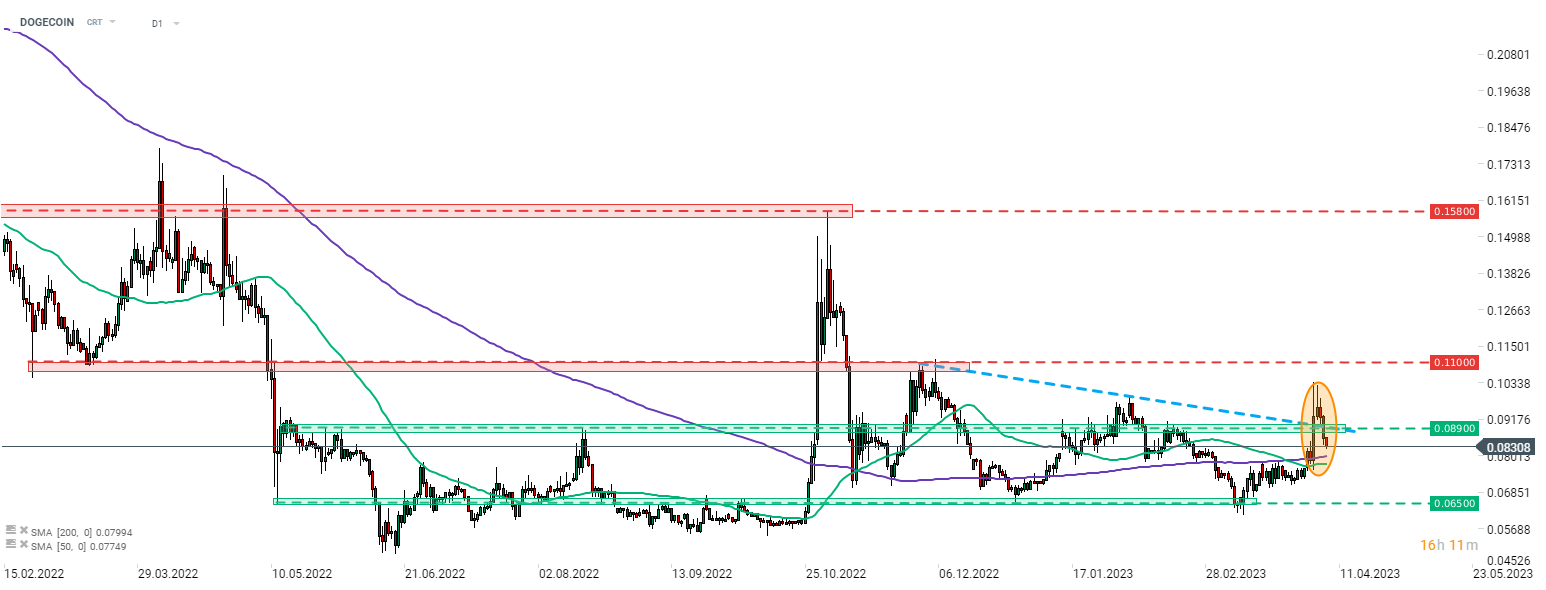 DOGECOIN is one of the worst performing cryptocurrencies today. The coin has almost fully erased the price jump triggered by Elon Musk changing Twitter logo to Shiba Inu. Source: xStation5