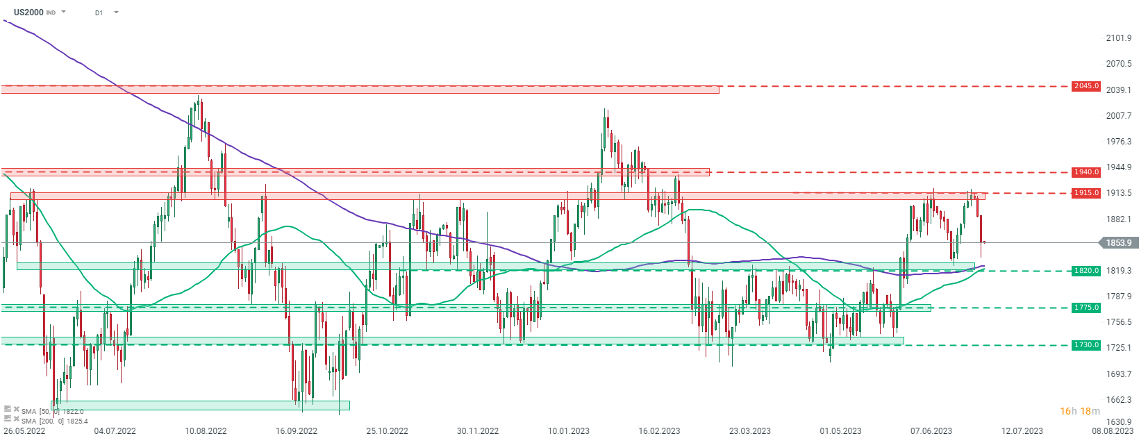 Small-cap Russell 2000 (US2000) was the worst performing major Wall Street index yesterday. Index deepened recently launched pullback and moved close to the 1,820 pts support zone, which is a neckline of the double top pattern. Source: xStation5
